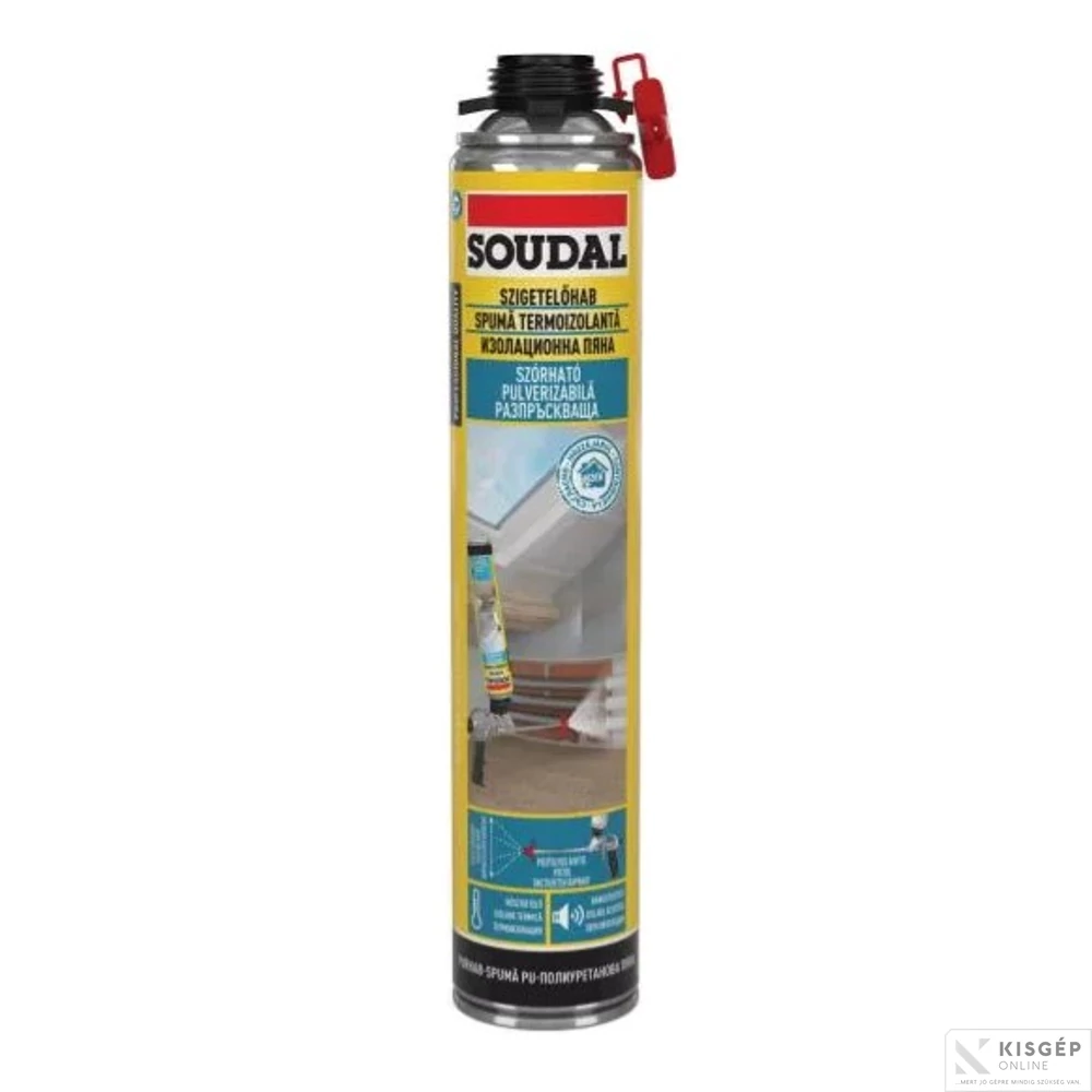 - A munka megkezdése előtt takarja le a környező felületeket a felesleges szennyezés elkerülése érdekében. Beltéri használat során szükséges a megfelelő szellőztetés biztosítása. Viseljen védőkesztyűt és védőszemüveget. Helyezze fel a szórófejet a kinyomópisztoly végére. Rázza fel a flakont legalább 20 másodpercen keresztül. Rögzítse a pisztolyt a flakonon. A felület legyen zsírtól és portól mentes. Nedvesítse meg a felületet vízpermetező segítségével. Nem szokványos felületeken végezzen előzetes összeférhetőségi próbát. Forgassa el a szórófejet ha szükséges (vízszintes vagy függőleges felhordástól függően). A felhordott hab mennyisége szabályozható a pisztoly végén található csavar segítségével. Hordja fel a habot 30-40 cm távolságból a felületre. A felhordás távolsága határozza meg a szóráskép szélességét. A hab a felhordott mennyiség kétszeresére dagad. Ne hordjon fel egyszerre háromnál több kb. 1 cm-es réteget, illetve ne hordjon fel egyszerre 2,5 cm-nél vastagabb réteget. Ha egynél több réteg felhordása szükséges, várjon kb. 30 percet az egyes rétegek között, valamint permetezze meg vízzel. Mielőtt újra használni kezdi a habot, tisztítsa meg a szórófejet és rázza fel alaposan. Tisztítás frissen Soudal PU tisztítóval vagy Swipex törlőkendővel, kötés után Soudal PU eltávolító segítségével, illetve mechanikusan. A tisztító használata előtt győződjön meg, hogy nem károsítja a felületet. Kifejezetten műanyag és lakkozott felületeken vagy festett felületek lehetnek érzékenyek.